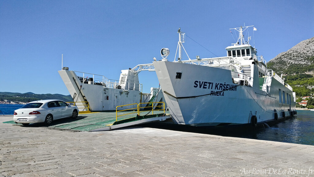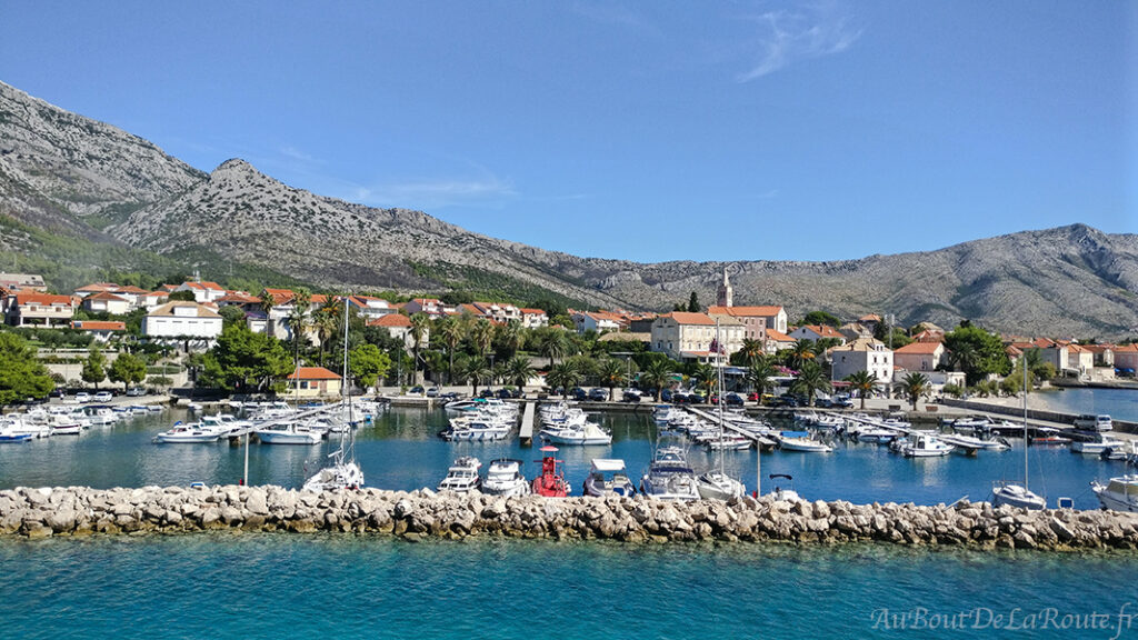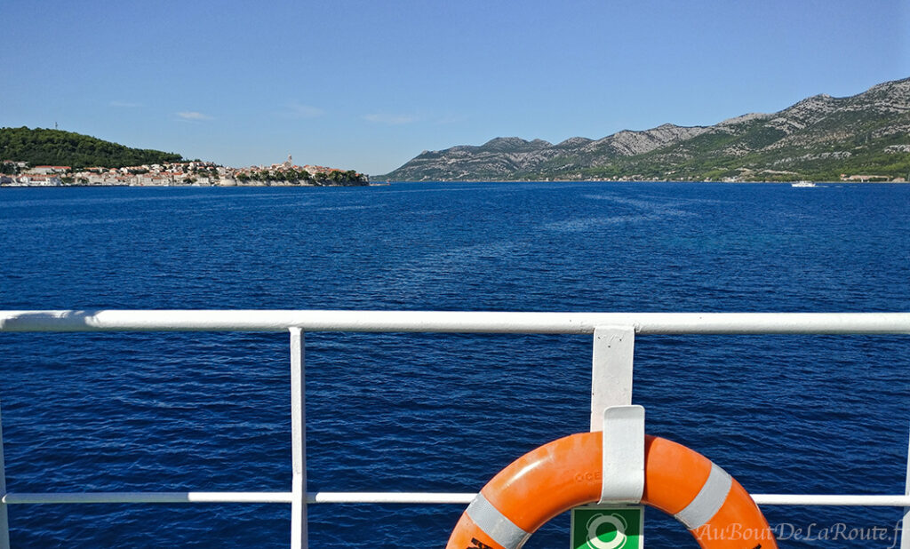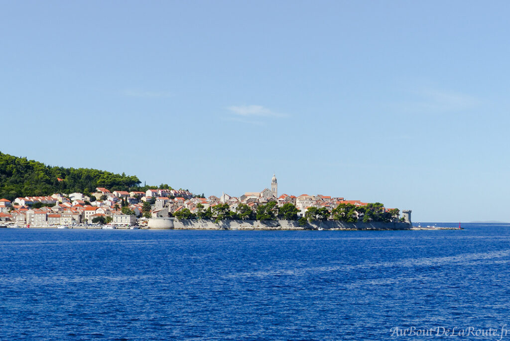 De retour au port d’Orebić pour l’embarquement sur le ferry, celui-ci ne prend que quelques minutes. Nous profitons ensuite de la traversée pour admirer la côte, les îles et notre approche de Korčula. Le ferry nous débarque à Dominče, situé à quelques minutes en voiture de la cité fortifiée de Korčula.
