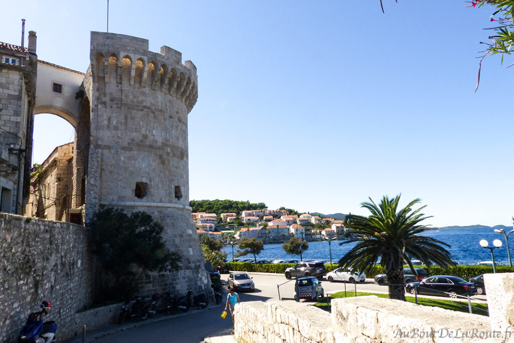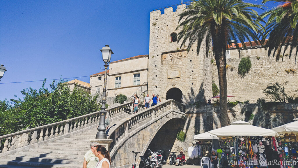 Nous débarquons du ferry et direction la cité fortifiée de Korčula. Nous garons la voiture au parking situé au-dessus de la ville. La cité est assez petite et facile à visiter à pieds. Nous avons tout de suite était séduit par son charme, avec ses petites ruelles piétonnes, son énergie débordante avec les nombreux restaurants, bars et commerces, avec pour toile de fond, toujours les couleurs éclatantes de l’eau bleu de la mer et des pins verdoyants.