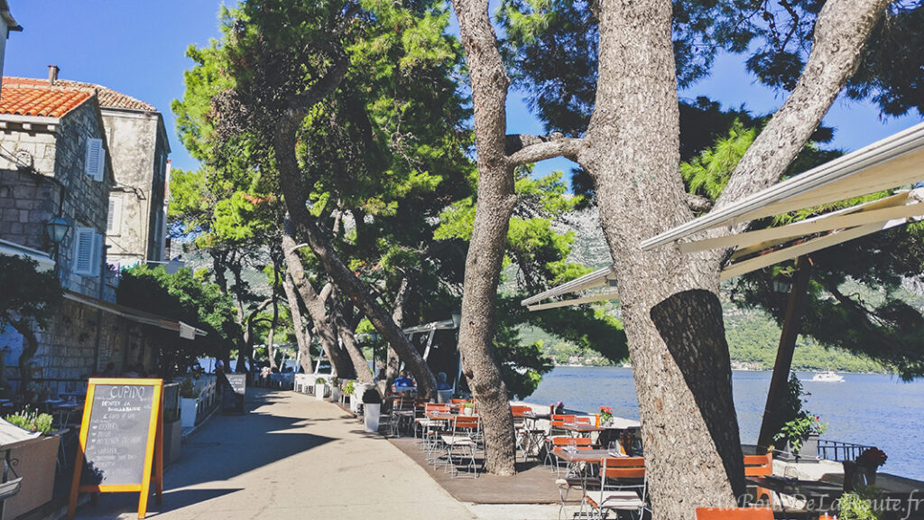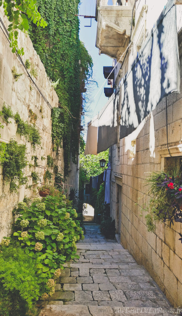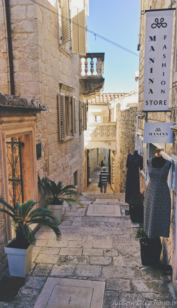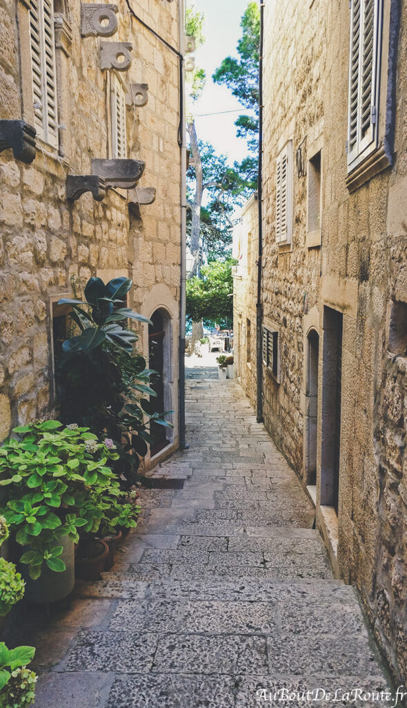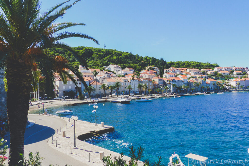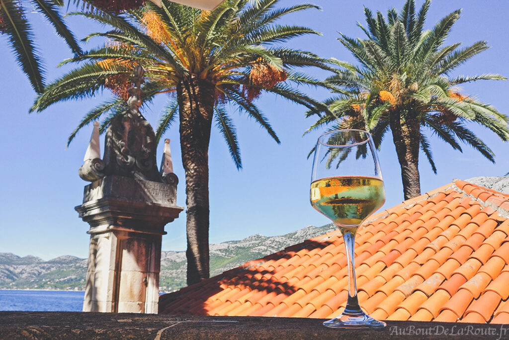 Il est 12h30 et la faim se fait sentir, nous nous arrêtons donc au restaurant Largo, face au port et en haut des escaliers en pierres, pour manger un plat délicieux accompagné d’un merveilleux blanc local. Tout est parfait et le décor sous les palmiers est idyllique. Nous reprenons ensuite la visite de la cité, à travers les ruelles piétonnes ombragées et fleuries qui ne manquent pas de charmes. La promenade ouest de la cité, bien que située sous les pins et avec une magnifique vue sur la presqu’île de Pelješac, nous a moins enchanté car les terrasses des restaurants sont trop nombreuses et donnent un effet de masse.
